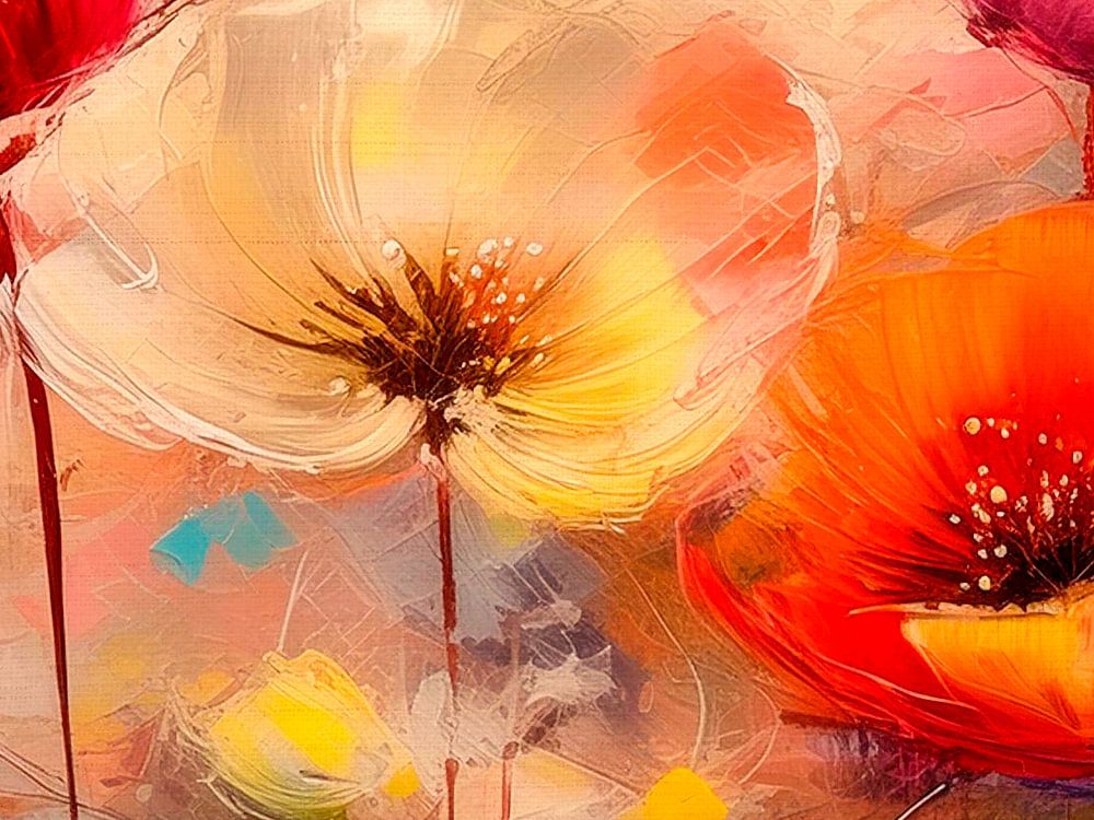Ein dynamisches Zusammenspiel von Textur, ausdrucksstarker Pinselführung, erdigen Sandtönen und leichten, aber farbenfrohen, abstrakten Motiven.