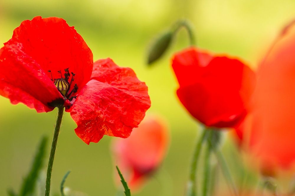 Foto von einer Reihe von Mohnblumen im Frühling aufgenommen. Aus ihnen quillt der Frühling mit all seinen Rottönen hervor. Man kann die Zerbrechlichkeit der zarten Blüten deutlich erkennen. Rot ist die Hauptfarbe.