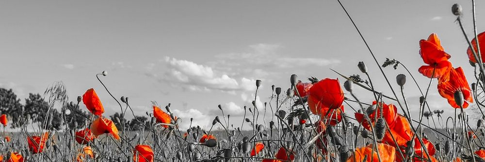 Die leuchtend roten Blüten des in Mitteleuropa wilden Klatschmohns blühen ab Ende Mai und kennzeichnen den Beginn des Frühsommers. Klassische Landschaftsansicht im Panoramaformat. Eine idyllische Schwarz-weiß Aufnahme mit farblich hervorgehobenen Blüten.