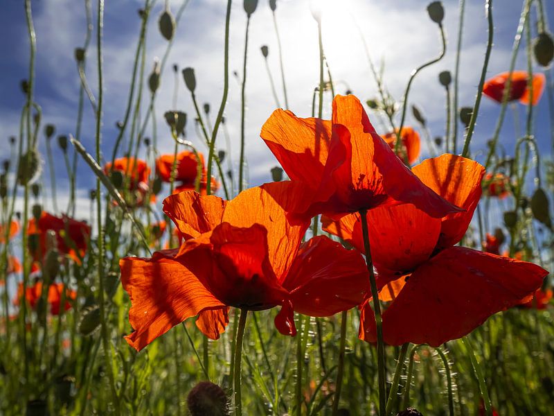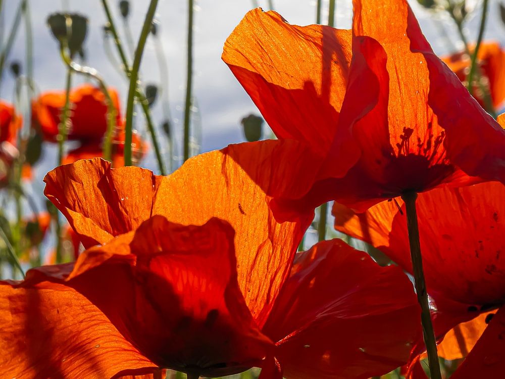 Ich fotografiere diese Mohnblumen im Gegenlicht in Frankreich.