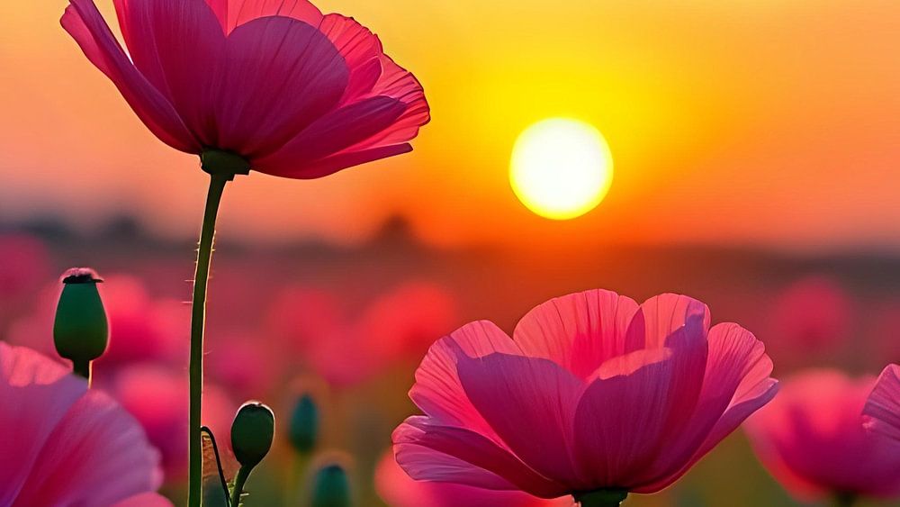 In diesem atemberaubenden Bild erstrahlen leuchtende Mohnblumen in voller Blüte, während die Sonne sanft am Horizont untergeht. Der Himmel ist ein faszinierendes Farbenspiel aus warmen Gold- und Orangetönen, die nahtlos in sanfte Rosa- und Lilatöne übergehen, als ob die Natur selbst mit einem Pinsel arbeitet. Die Mohnblumen, mit ihren zarten, roten Blütenblättern, scheinen im sanften Abendwind zu tanzen und stehen in starkem Kontrast zu den warmen Farben des Himmels.