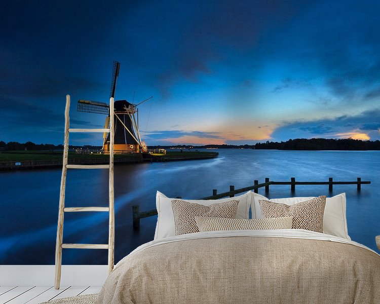 De verlichting aan de Hoornsedijk bij molen De Helper is aangegaan. De zon is ondergegaan aan het Paterswoldsemeer. Er is zojuist een boot langsgekomen die een spoor in het water heeft nagelaten. De molen is een grondzeiler, die in 1863 is gebouwd. De poldermolen bemaalt het Meerschap Paterswolde. (Sluitertijd van de foto is 30 seconden)