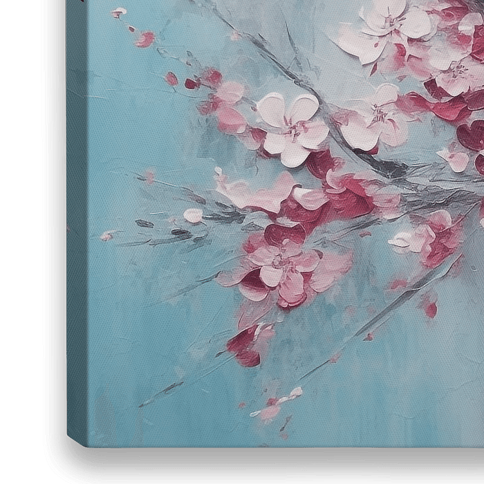 Der elegante Kirschblütenbaum, der in einen sanften Nebel aus blauen, hellgrauen und weißen Farbtönen gehüllt ist, strahlt eine Atmosphäre von Zärtlichkeit und schlichter Schönheit aus.