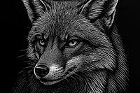 Ein intensives Fuchsporträt in Schwarz und Weiß zeigt scharfe Augen, dreieckige Ohren und eine geschmeidige Schnauze. Feine Linien bilden die Felltextur, wobei die Schraffur Tiefe und Glanz suggeriert. Der starke Kontrast zum dunklen Hintergrund unterstreicht die Symmetrie des Gesichts, während die subtilen Kurven um den Hals für einen…