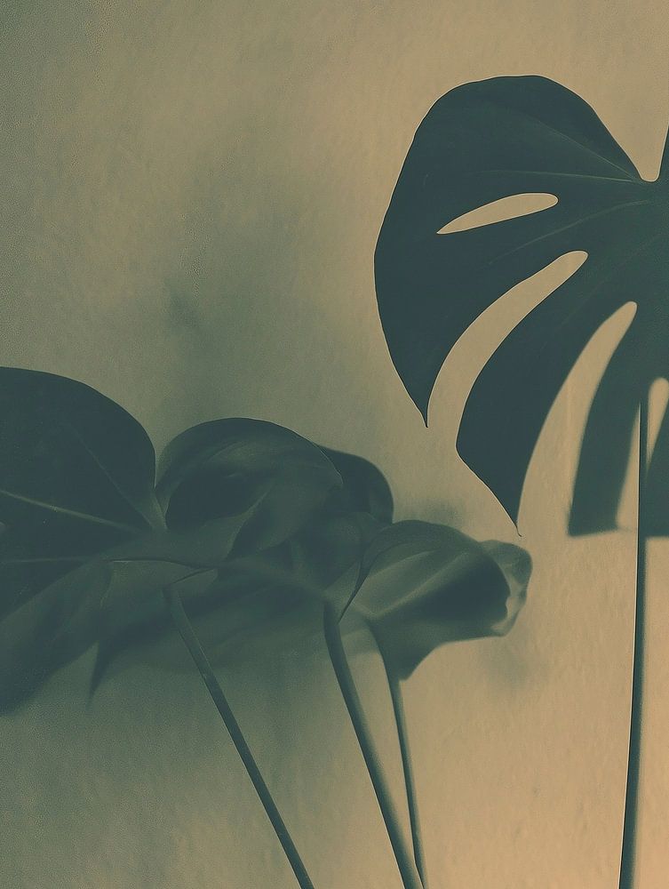 Eine Monsteraplante in sanftem, diffusem Licht, das die Blätter wie eine Schicht vergilbten Lacks umhüllt. Die charakteristischen, eingeschnittenen Blattformen wirken scharf und grafisch, während die Textur der Blattoberfläche – mit sichtbaren Adern und subtilen Farbnuancen – die Fülle und Tiefe einer gemalten Oberfläche besitzt. Die…