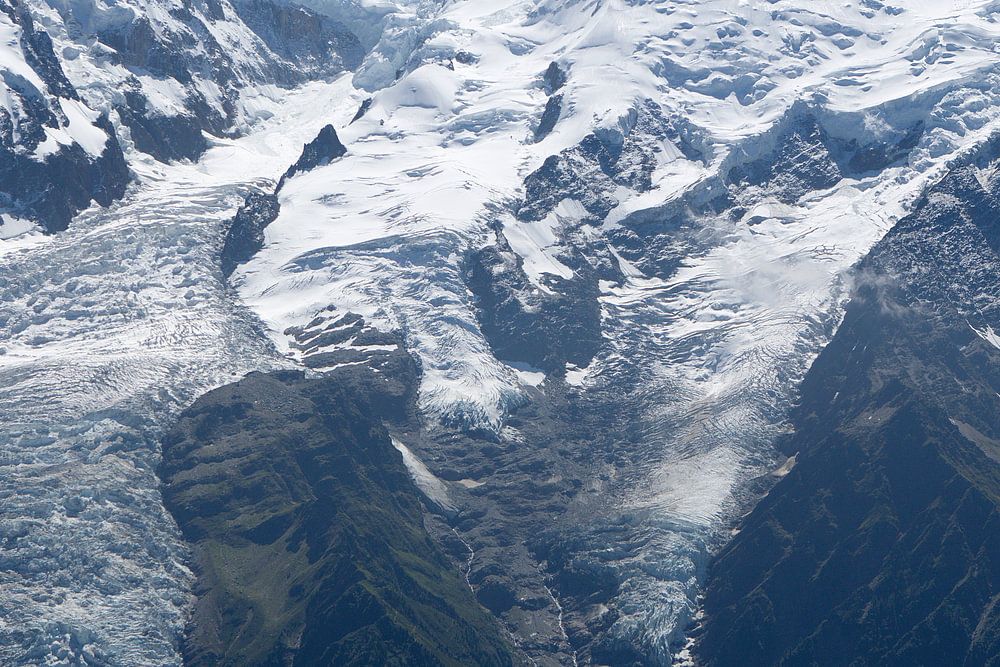 Das Mont-Blanc-Massiv mit dem höchsten Berg der Alpen wird flankiert von Mont Maudit, Mont Blanc de Tacul und Dome de Gouter. Riesige Eiszungen fließen nach unten und bilden Gletscher. Dieser Gebirgszug liegt oberhalb von Chamonix in den französischen Alpen.