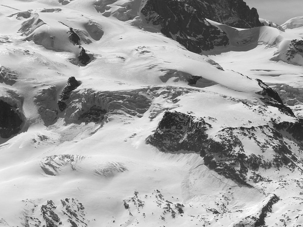 Das Monte-Rosa-Massiv mit den Gipfeln der Dufourspitze und des Nordends. Er ist der höchste Berg der Schweiz, aber der Berg liegt teilweise in Italien. Im Vordergrund der große Monte-Rosa-Gletscher.