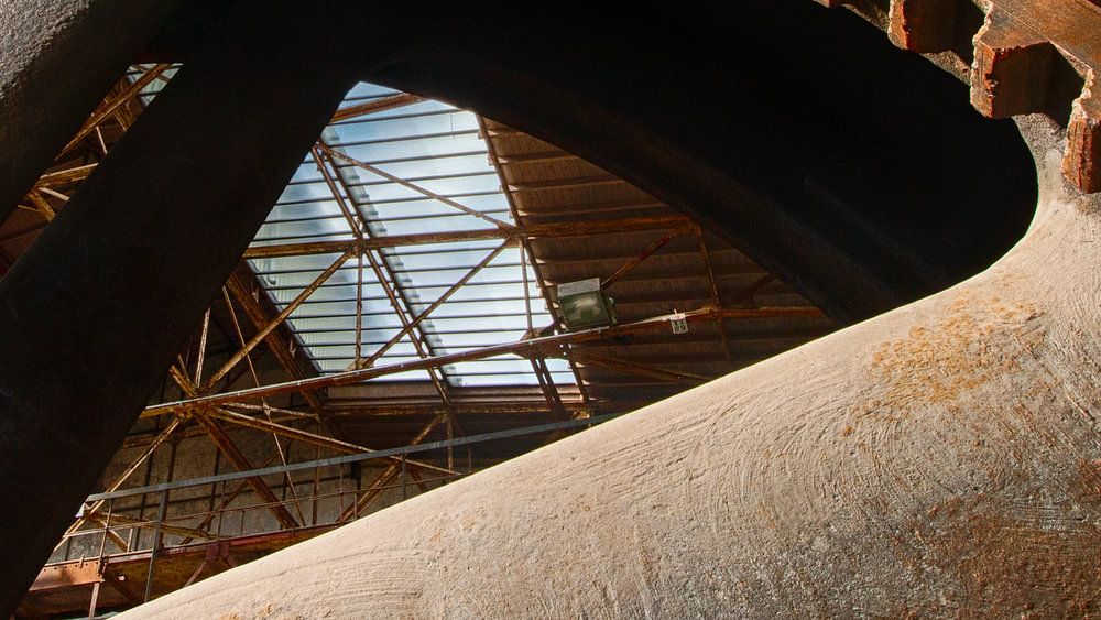 Dieses beeindruckende Foto zeigt ein riesiges Bauteil einer Tandem-Dampfmaschine, ein Symbol für die industrielle Revolution und die ständige Weiterentwicklung der Technik. Die imposante technische Meisterleistung, die in der trostlosen Umgebung eines ehemaligen Kohlebergwerks in Deutschland aufgenommen wurde, strahlt eine raue Schönheit inmitten der rostigen Überreste der Bergbauvergangenheit aus.
