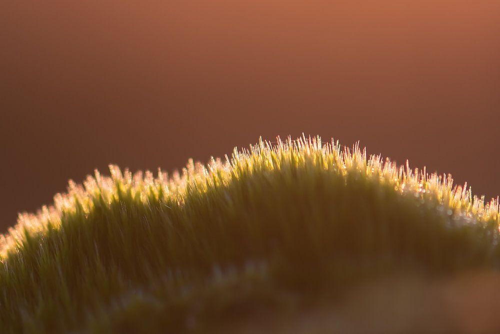 Nahaufnahme eines Mooshaufens, mit einem schönen goldenen Schein, bei der untergehenden Sonne im Hintergrund