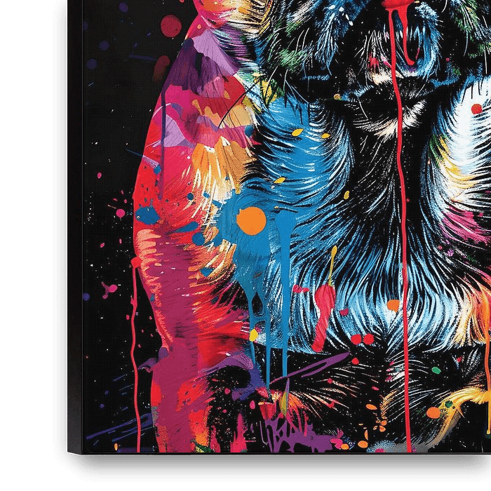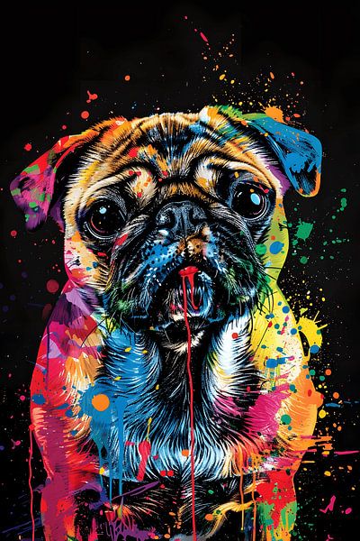 Bestelle dieses abstrakte Wandbild Mops-Hund mit Malerfürzen von MNS Designs als Reproduktion auf Leinwand, Alu-Dibond, als Poster, Fototapete oder Acrylglasbild.