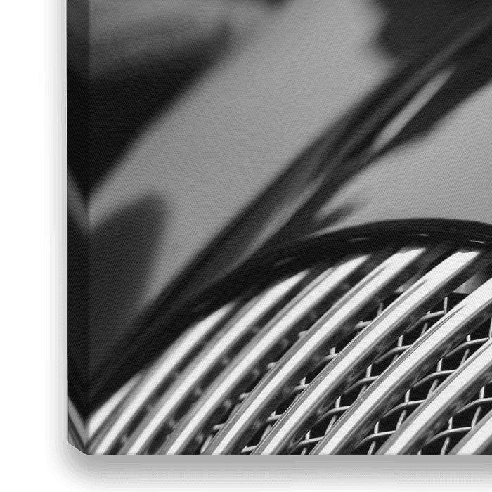 Details auf der Motorhaube eines englischen Morgan Plus 8 Oldtimer. Schwarzweiss-Bild.