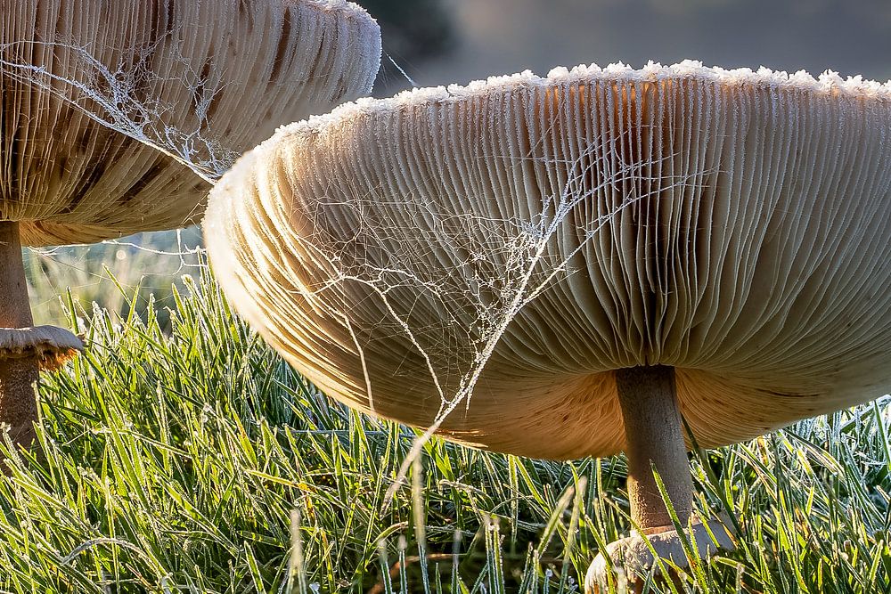 Morning Glow ist ein Porträt von zwei großen Parasolpilzen an einem kalten Morgen in der Veluwe. Man spürt die Stille, die Ruhe und die Kälte auf dem Foto, bis einen Moment später die Sonne durchbricht und die Szene in der Wärme verschwindet.