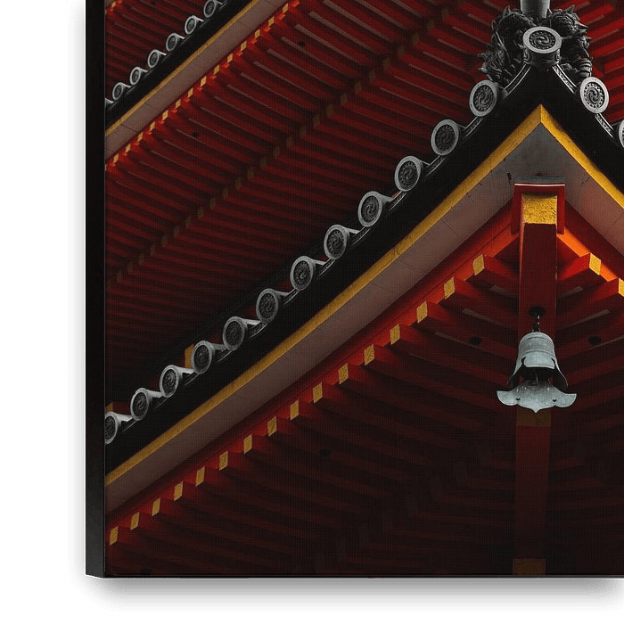 Nahaufnahme eines Tempeldachs in Kyoto im frühen Morgenlicht. Die klare Symmetrie, Linien und wiederkehrenden Muster zeigen die Ruhe und Handwerkskunst der traditionellen japanischen Architektur.