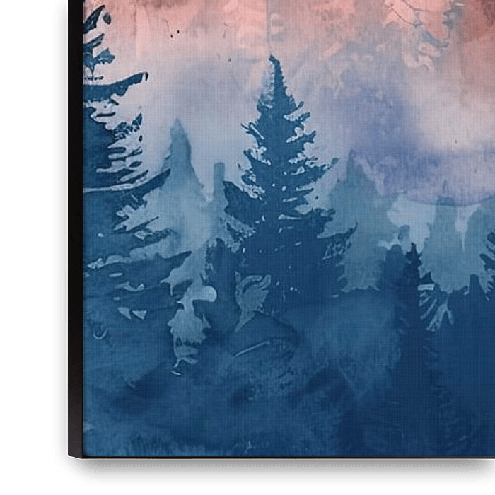 Dieses heitere Aquarell zeigt eine Waldlandschaft, die in einen weichen, pastellrosa Morgennebel gehüllt ist.