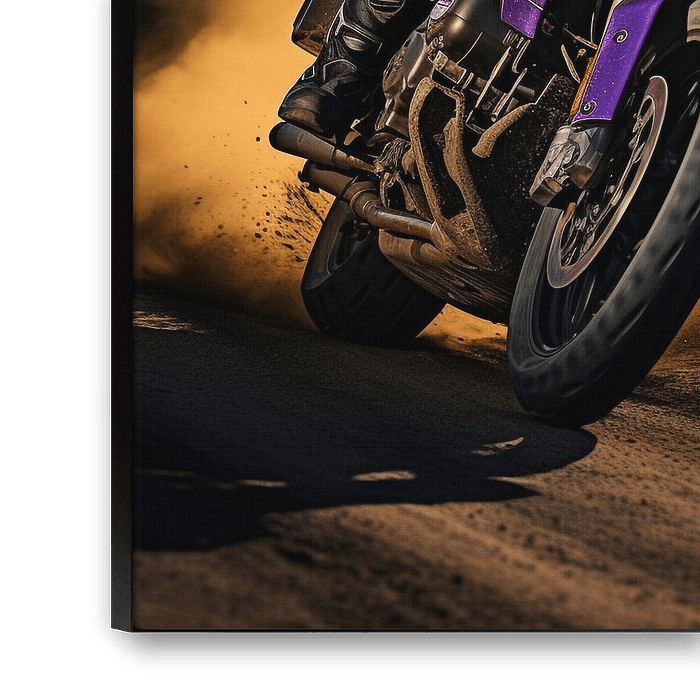 Ein lilafarbenes Motorrad in voller Fahrt liegt leicht in einer Kurve