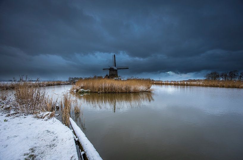 Bedrohlicher Himmel in einer Winterlandschaft. Die Windmühlen bei Restingburg spiegeln sich wunderschön im Wasser mit dem bedrohlichen Himmel