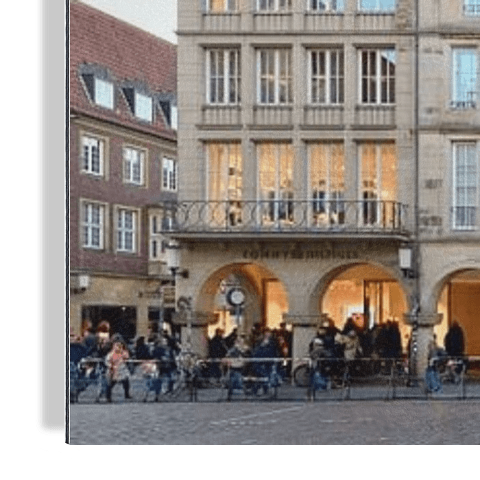 Bestelle das Foto Münster Prinzipalmarkt Panorama von Panorama Streetline als Reproduktion auf Leinwand, Alu-Dibond, als Poster, Fototapete oder Acrylglasbild.
