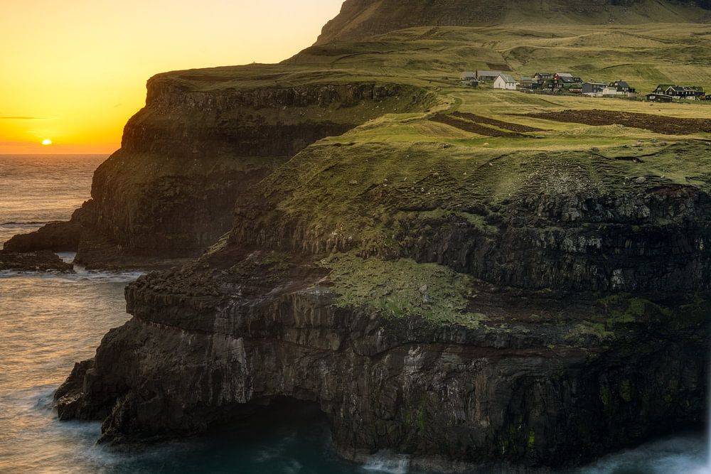 Die Einheimischen der Färöer sagen, dass sie froh sind, wenn es einen Sonnentag gibt, denn es ist meist bewölkt, oft windig und meistens regnet es. Daher ist dies ein Bild, das man im Jahr nicht oft sieht: Ein fast klarer Himmel bei Sonnenuntergang. Der Múlafossur-Wasserfall auf den Färöer-Inseln, einer autonomen Inselgruppe, die zum Königreich Dänemark gehört.