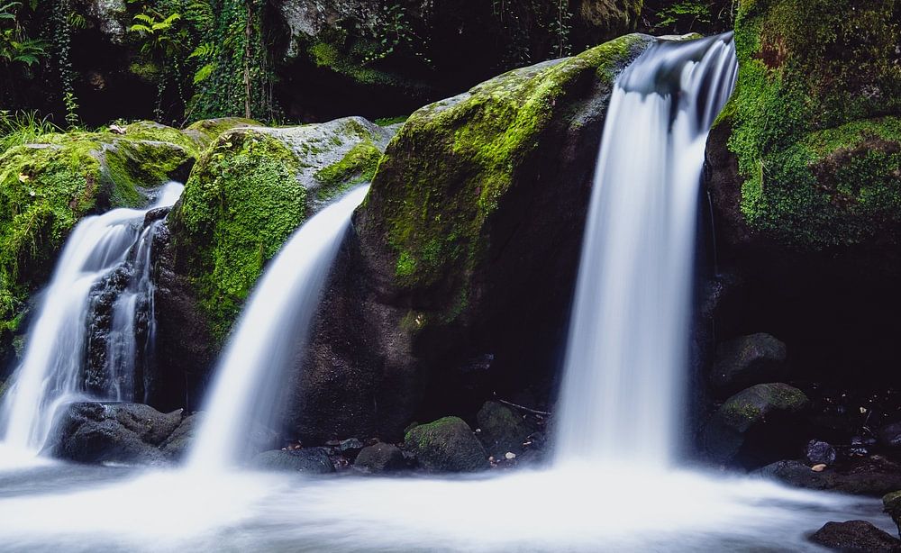 Dieses Foto zeigt eine bezaubernde Naturszene eines doppelten Wasserfalls, der sanft über moosbewachsene Felsen fließt, tief in einem Waldgebiet. Das Wasser wurde mit einer langsamen Belichtungszeit fotografiert, was ihm einen seidigen und fließenden Effekt verleiht, während es in ein klares, flaches Becken fließt. Die Umgebung ist üppig und grün, mit Farnen, Efeu und dichten Büschen, die dem Bild eine ruhige und unberührte Atmosphäre verleihen. Die Felsformationen sind mit leuchtend grünem Moos bewachsen, das einen schönen Kontrast zum kühlen, weißen Wasser bildet. Das Ganze strahlt Ruhe und natürliche Schönheit an einem Ort aus, an dem die Zeit stillzustehen scheint.