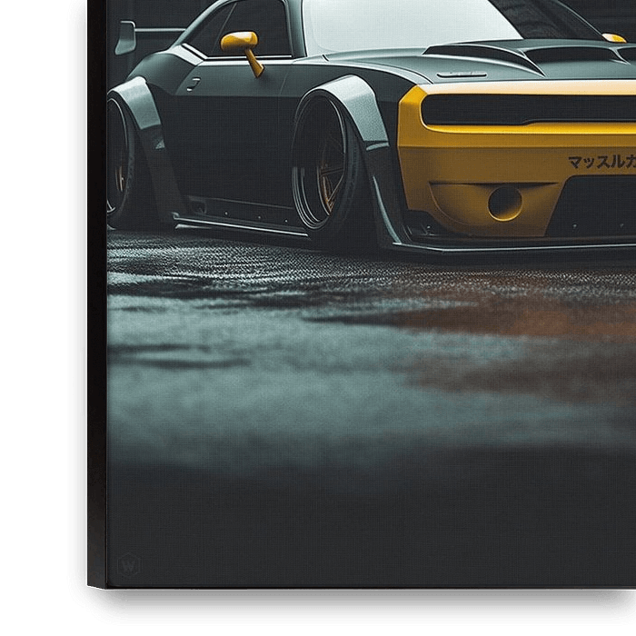 Ein brachiales Muscle Car, das durch die Linse der Underground-Rebellion neu interpretiert wurde. In mattes Schwarz mit aggressiven gelben Akzenten gehüllt, sitzt dieses Breitbau-Biest tief und bedrohlich auf regennassem Asphalt. Das Wort "PUNK" schreit fett in verunstaltetem Gelb über den Hintergrund, während japanisches…