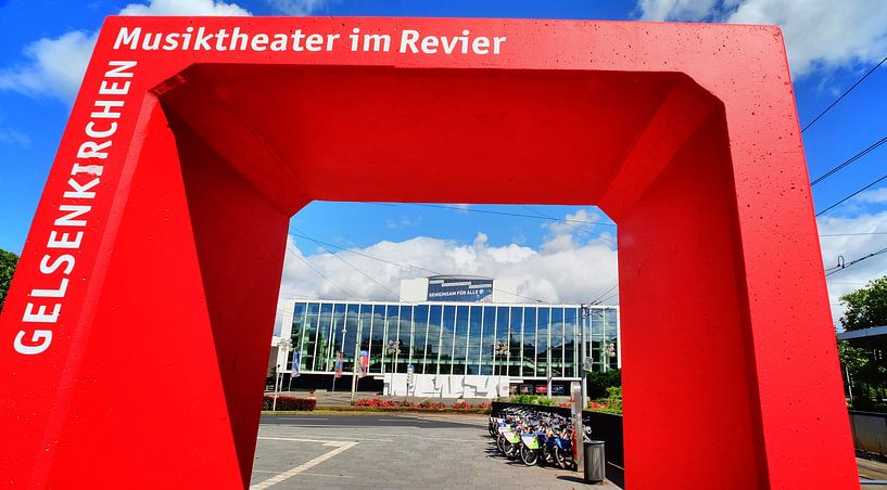 Kunstaktion im Rahmen der Fußball EM 2024 in Gelsenkirchen mit roten Toren. Hier vor dem Musiktheater im Revier. MiR.