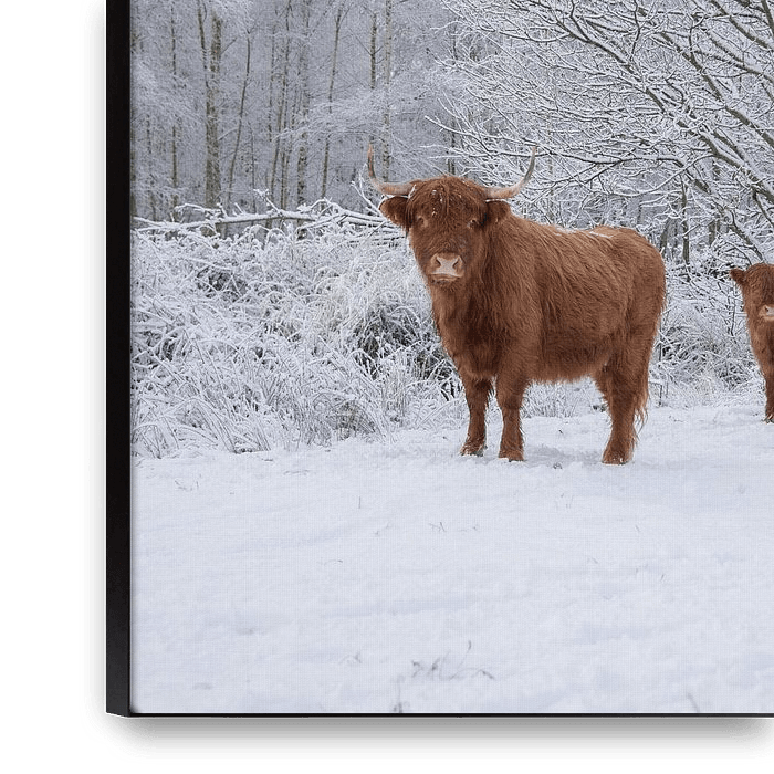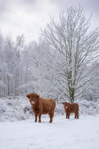 Bestelle dieses Schottische Hochlandrind Wandbild Mutter und Kind im Schnee... von Ans Bastiaanssen als Reproduktion auf Leinwand, Alu-Dibond, als Poster, Fototapete oder Acrylglasbild.