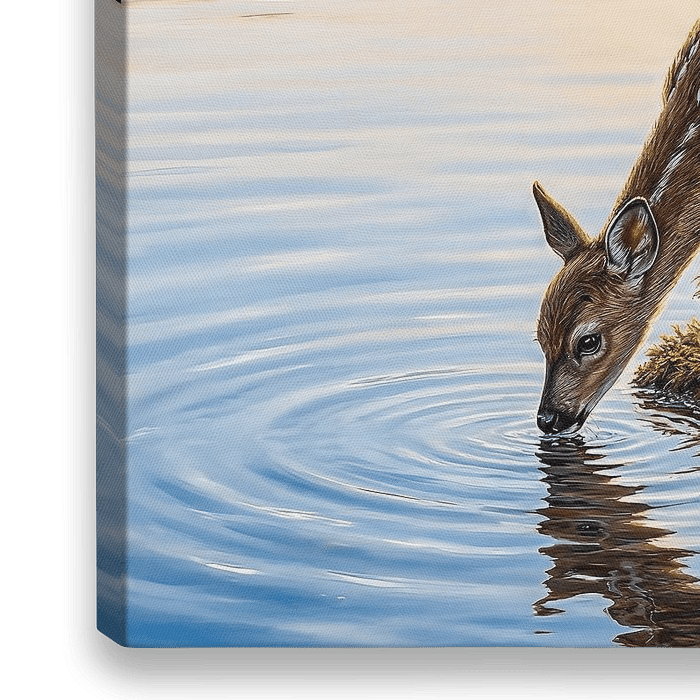 Bestelle diese Malerei Mutterliebe im Goldlicht Rehe am See von Max Steinwald als Reproduktion auf Leinwand, Alu-Dibond, als Poster, Fototapete oder Acrylglasbild.