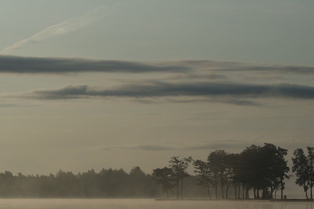 Een spiegeling in het water van het Giethoornsche meer in de vroege ochtend.