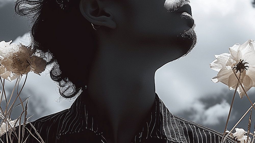 Ein Mann mit großer Sonnenbrille genießt den herrlichen Sonnenschein mit wunderschönen zarten Blumen im Vordergrund.