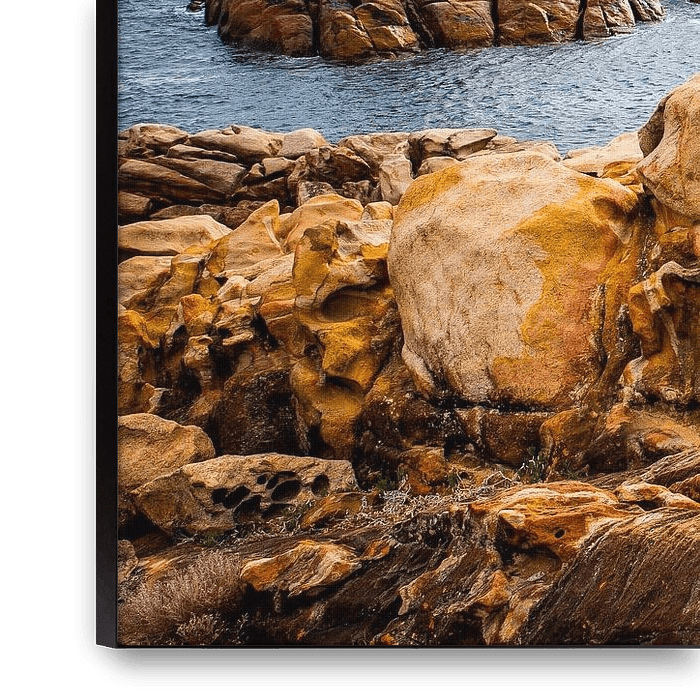 Eine schroffe australische Steinküste aus massiven Granitfelsen prägt den Vordergrund dieser eindrucksvollen Aufnahme. Die zerklüftete Küstenlinie führt den Blick hinaus aufs ruhige Meer, wo im Mittelgrund eine langgestreckte Felsformation an den Körper eines gestrandeten Wals erinnert. Das stille, tiefblaue Wasser bildet einen sanften…