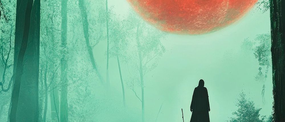 In einem mystischen Wald, umhüllt von nebeligem Geheimnis, thront ein blutroter Mond über einer einsamen Figur, die auf geheimnisvollen Stufen verweilt. Die atmosphärische Düsternis und die surrealen Farben verleihen diesem Kunstwerk eine spannende Aura. Ideal für ein Wohnzimmer, wo es Gespräche anregt und die Fantasie entfesselt.