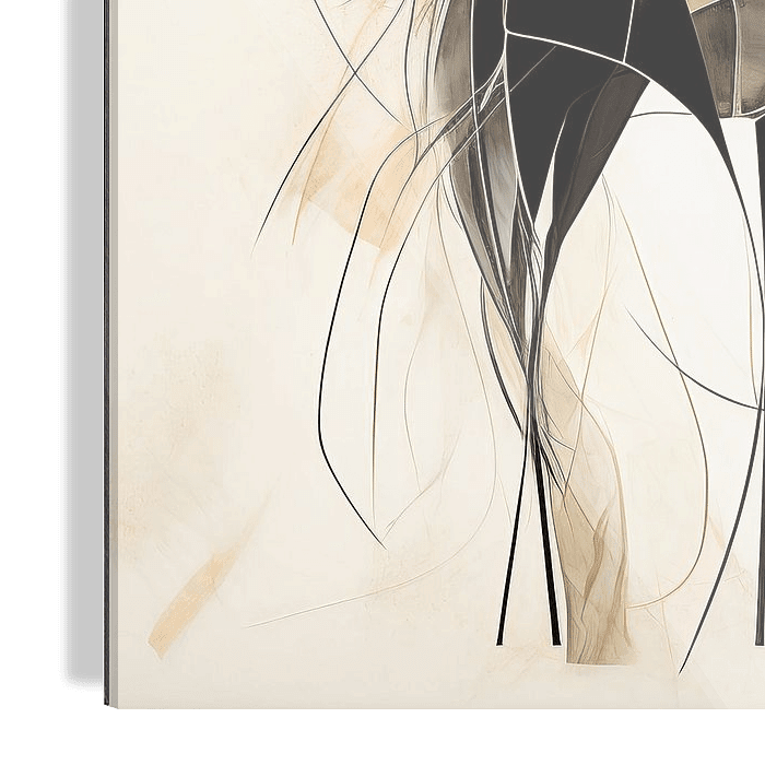 Eine raffinierte und faszinierende Kunstkomposition, die zwei Pferde in einem minimalistischen Linienstil darstellt, durchzogen von einem Vintage-Aquarellmuster in Schwarz und Beige. Die abstrakte Textur und die neutrale Abstraktion bilden einen harmonischen Kontrast auf einem strahlend weißen Hintergrund, der auf einem faszinierenden…
