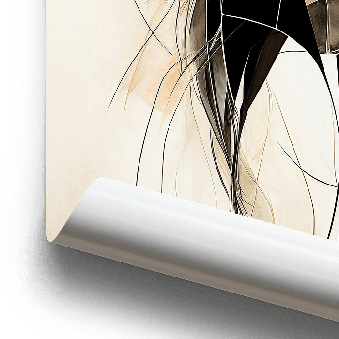 Eine raffinierte und faszinierende Kunstkomposition, die zwei Pferde in einem minimalistischen Linienstil darstellt, durchzogen von einem Vintage-Aquarellmuster in Schwarz und Beige. Die abstrakte Textur und die neutrale Abstraktion bilden einen harmonischen Kontrast auf einem strahlend weißen Hintergrund, der auf einem faszinierenden…