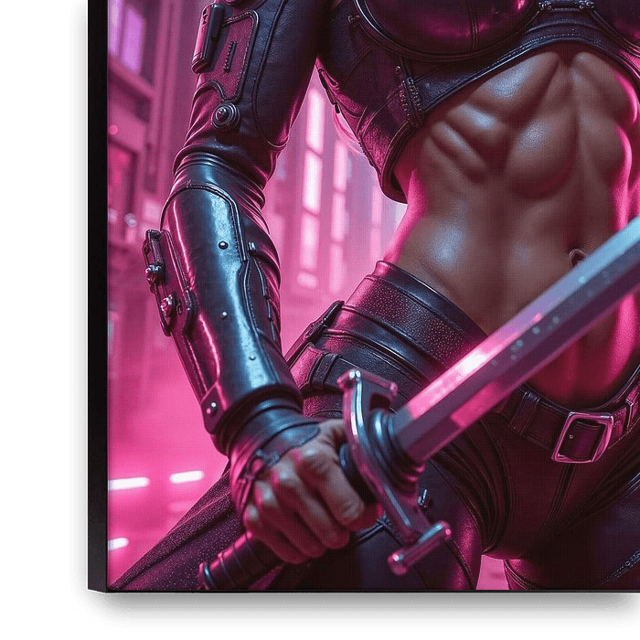 Bestelle dieses Porträt NEON AMAZON - Die blonde Frau mit dem Schwert in der Cyberpunk City von INFERAURUM als Reproduktion auf Leinwand, Alu-Dibond, als Poster, Fototapete oder Acrylglasbild.