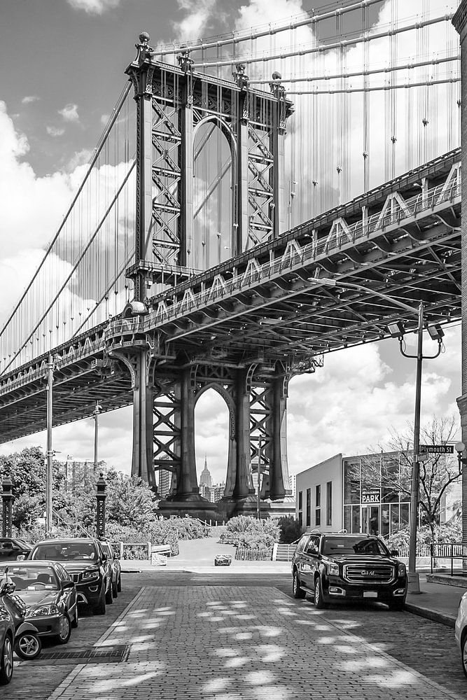 Die Manhattan Bridge überquert den East River und verbindet die beiden Stadtteile Lower Manhattan (Chinatown) und Brooklyn miteinander. Direkt an und unter der Brücke befindet sich DUMBO, ein immer beliebter werdendes Wohnviertel. Diesen Blick erhält man von der Washington Street.