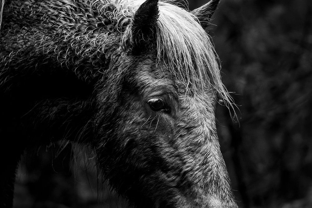 Diese kraftvolle Schwarz-Weiß-Fotografie fängt den Moment der Kontemplation eines Pferdes ein, das in die Dunkelheit eines dichten Waldes gehüllt ist. Das nasse, gelockte Fell und die helle Mähne bilden einen schönen Kontrast zu den Schatten und enthüllen das rohe, reine Wesen des Tieres. Der sanfte Blick und die subtilen Details in der Textur von Haut und Haar verleihen dem Bild einen zeitlosen, fast poetischen Ausdruck. Ein Meisterwerk für Liebhaber der monochromen Fotografie und tiefgründiger, emotionaler Naturbilder.