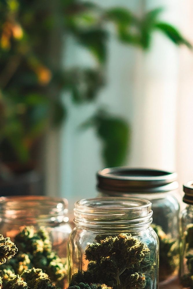 Ein sanftes Licht füllt den Raum und beleuchtet das kunstvoll arrangierte Stillleben aus Glasgefäßen und üppigem Grün. Die erdigen Töne der Cannabisblüten harmonieren perfekt mit den lebendigen Pflanzen im Hintergrund. Diese harmonische Komposition eignet sich wunderbar für ein entspanntes Wohnzimmer, wo sie eine beruhigende Atmosphäre schafft.