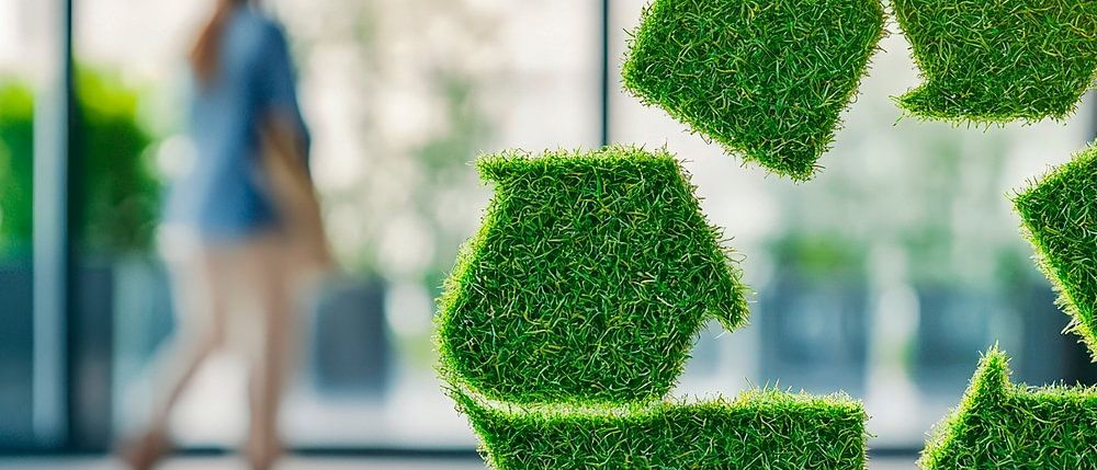 Inmitten einer urbanen Kulisse symbolisiert das lebendige grüne Recycling-Symbol Nachhaltigkeit und Umweltbewusstsein. Durch seine frische Ausstrahlung und die dynamischen Silhouetten im Hintergrund vermittelt es ein Gefühl von Bewegung und Fortschritt. Ideal für das Büro, inspiriert es zu einem kreativen und verantwortungsvollen Arbeitsumfeld, das zum Umdenken anregt.