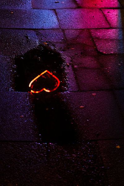 Bestelle dieses abstrakte Wandbild Nacht über St. Pauli: Reflektierte Neon-Herzen von Nils Steiner als Reproduktion auf Leinwand, Alu-Dibond, als Poster, Fototapete oder Acrylglasbild.