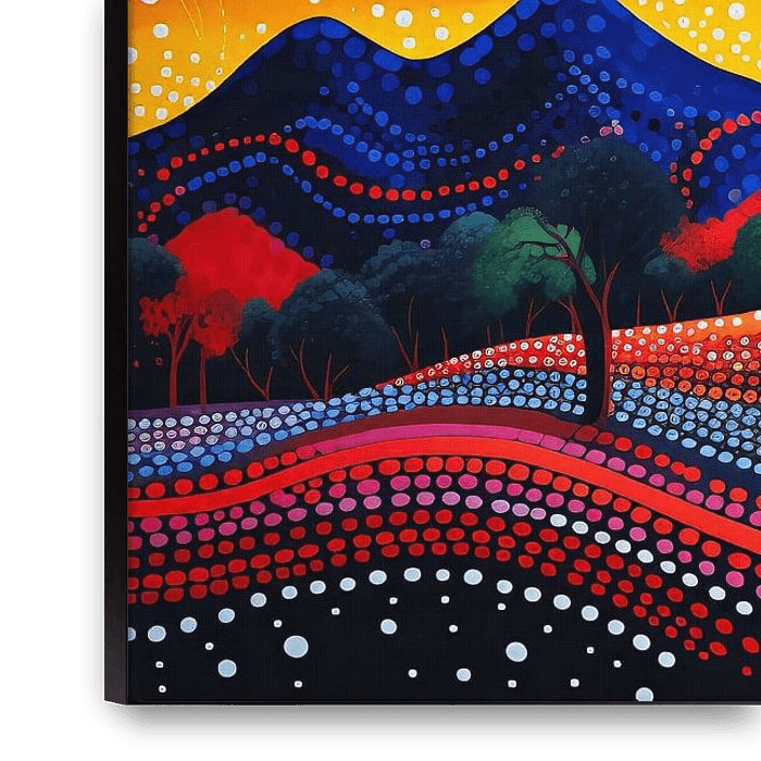 Die von den Aborigines inspirierte pointillistische Serie ist ein tiefes Zeugnis für den Geist der natürlichen Landschaft und ein Teppich künstlerischen Ausdrucks. Diese Kollektion lädt den Betrachter zu einer eindringlichen Pilgerreise durch Leinwände ein, die von uralten Erzählungen und dem rhythmischen Herzschlag der Erde pulsieren.…