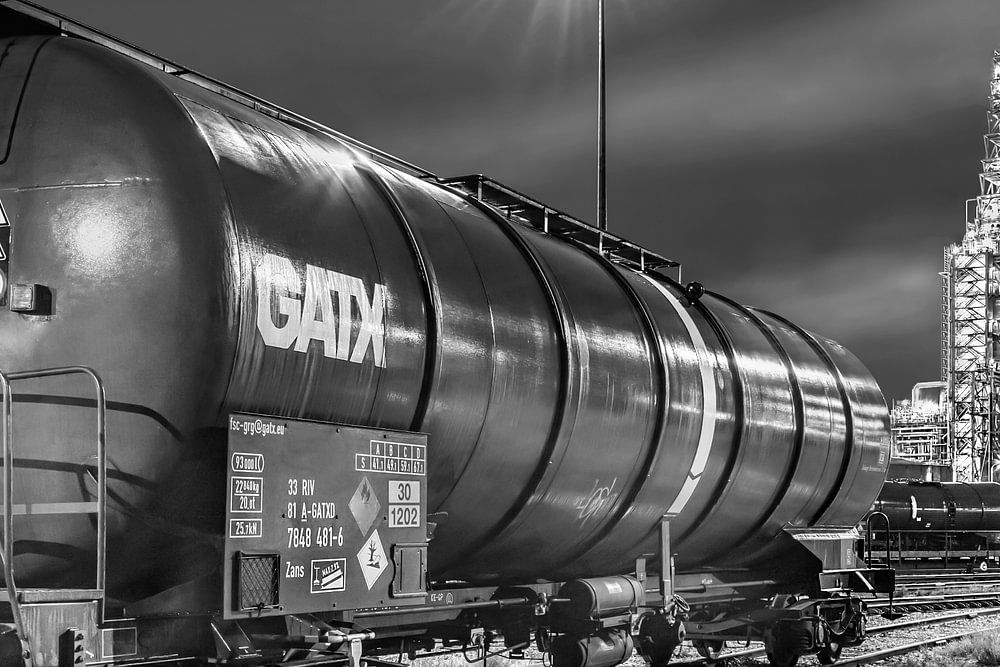 Nachtszene mit großen trainwagon und Petrochemie-Produktionsanlage auf dem Hintergrund, Hafen von Antwerpen, Belgien