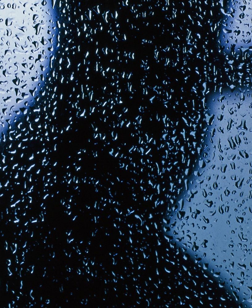 Glas: Das Glas ist mit Wassertropfen bedeckt. Die Tropfen sind klein und rund und reflektieren das Licht. Die Tropfen erzeugen einen Unschärfeeffekt und verdecken teilweise die Silhouette der Frau.