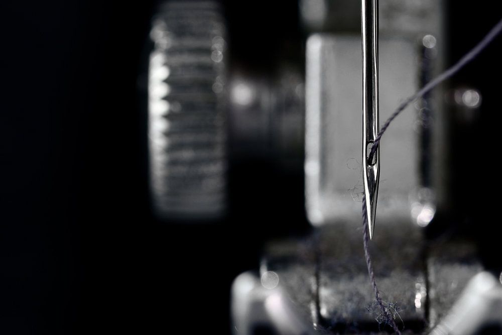 Nadel und Nähfuß einer Nähmaschine in der Vorderansicht als extreme Makroaufnahme, technische Erfindung für die Bekleidungsindustrie, dunkler Hintergrund mit Kopierraum, gewählte Schärfe, sehr geringe Tiefenschärfe