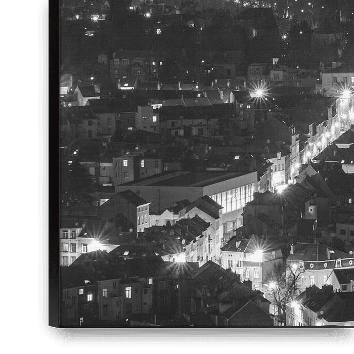 Eine Schwarz-Weiß-Ansicht der Liebfrauenkirche in Laeken, Brüssel, bringt eine ganz neue Dimension der Pracht zum Vorschein. Die in Grautöne gehüllte Kirche strahlt eine unaufdringliche Erhabenheit aus, während sich ihre beleuchtete Silhouette gegen den dunklen Himmel abhebt. Auf diesem Foto, das vom Dach eines Wolkenkratzers aus…