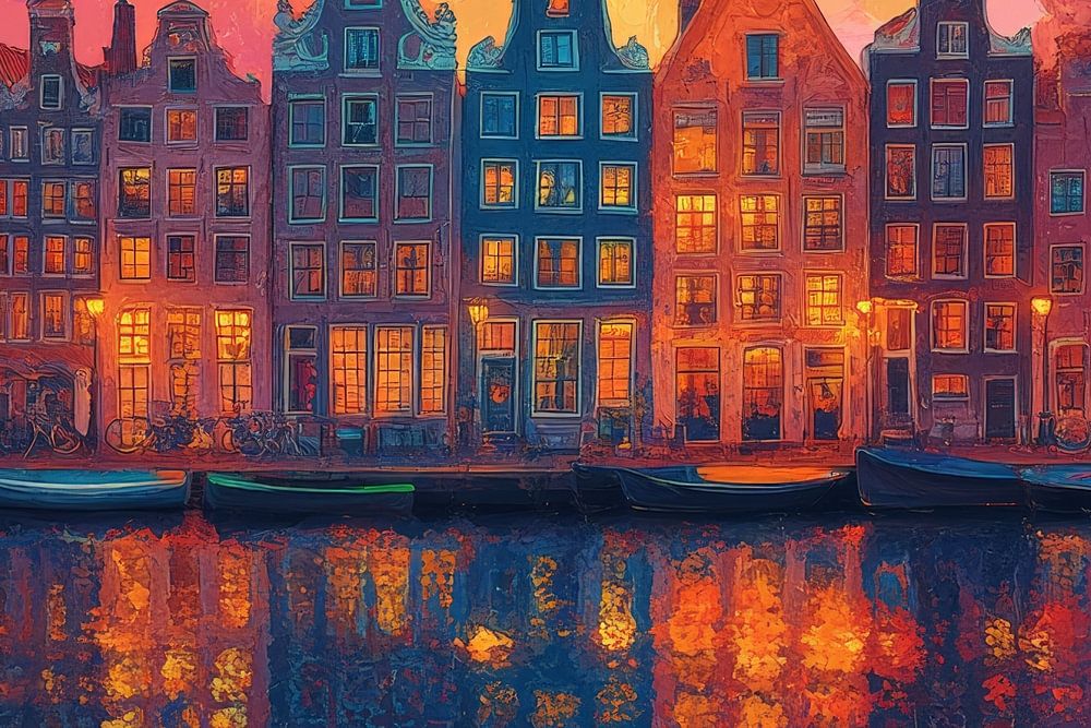 Das Bild zeigt eine Reihe farbenfroher Häuser entlang eines Kanals bei Nacht. Die Häuser sind in leuchtenden Rot-, Orange-, Gelb-, Blau- und Grüntönen gestrichen, und aus ihren Fenstern leuchten warme gelbe Lichter. Der Vollmond steht am Himmel und wirft ein sanftes Licht auf die Szene. Im Wasser spiegeln sich die Gebäude und Lichter, so dass eine symmetrische und bezaubernde Komposition entsteht.