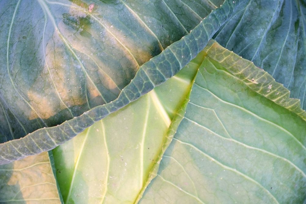 "Nahaufnahme von frischen Grünkohlblättern, bei denen die schöne Textur deutlich sichtbar ist. Die gewellten Ränder, das tiefe Grün und die zarten Adern heben sich deutlich ab, mit subtilen Schattierungen von Dunkelgrün bis fast Blaugrün. Das Licht unterstreicht die Textur der Blätter und die robuste, natürliche Schönheit des Grünkohls."