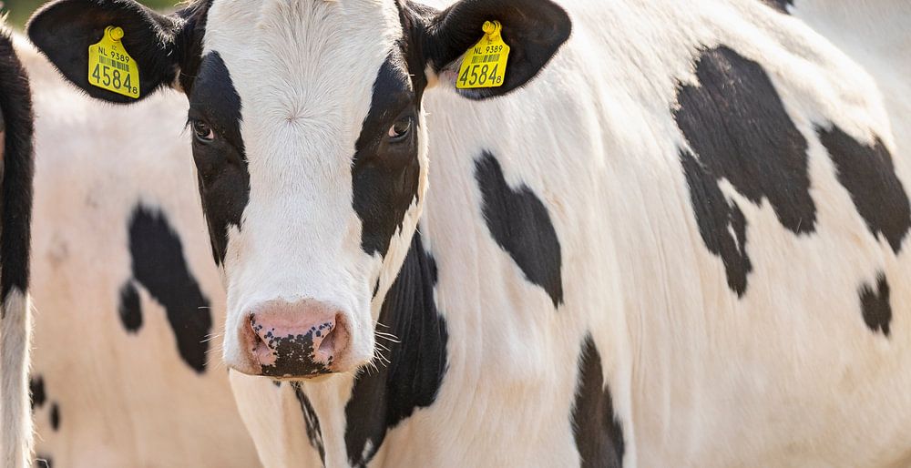 Schön auf der Wiese, eine Kuh, die mit klaren Ohrmarken aufschaut. Im Hintergrund einige grasende Kühe.