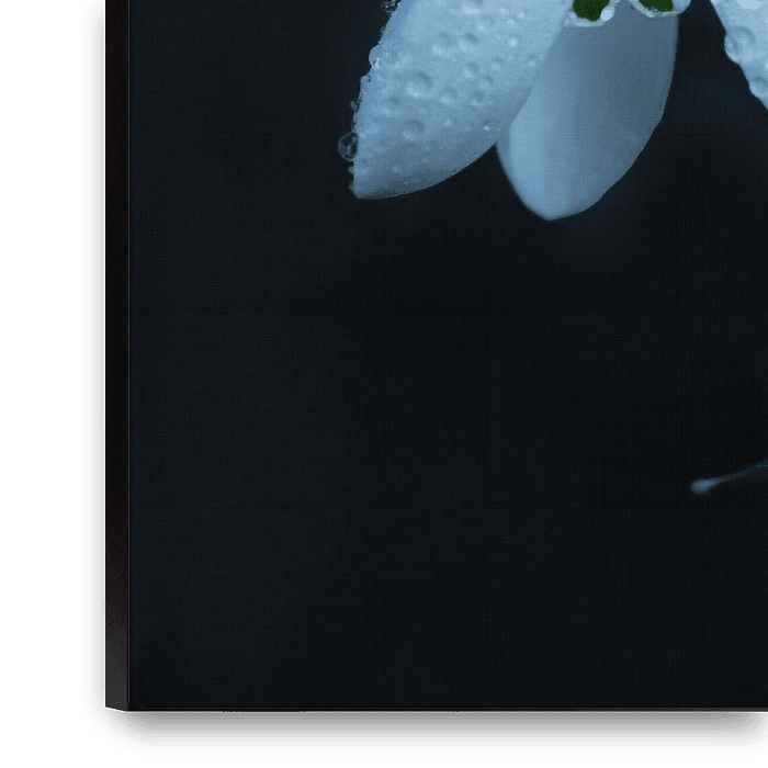 Bestelle dieses Blumen-Wandbild Nahaufnahme einer Schneeglöckchenblüte mit Wassertropfen von Jelena Jovanovic Fine Art als Reproduktion auf Leinwand, Alu-Dibond, als Poster, Fototapete oder Acrylglasbild.