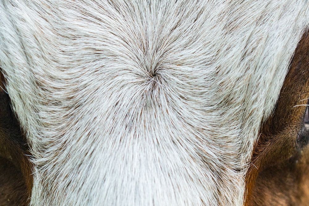 Nahaufnahme einer braunen und weißen Kuh auf einer Wiese