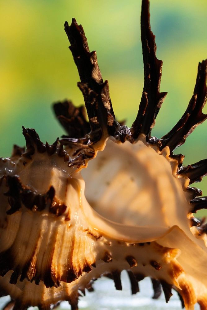 Dies ist ein Bild einer tropischen Muschel: der Murex Endivia. Diese Muschel hat eine schöne Form mit langen dunklen Stacheln. Ein außergewöhnliches Kunstwerk der Natur. Das verlangt nach einem schönen Foto.